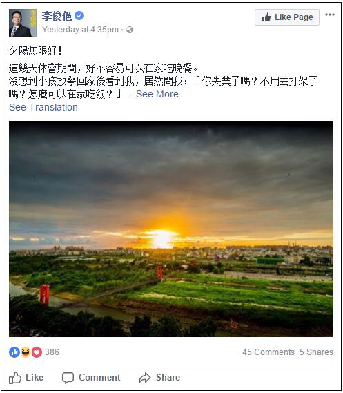 据《联合早报》报道,9月6日,台湾“绿委”李俊俋在脸书上面写了个小故事,这几日他休会,可以在家用餐,没想到孩子放学回家见到他,竟追问“你失业了吗?不用去打架了吗?怎么可以在家吃饭?”这让他有点哭笑不得。