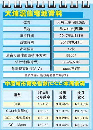 中原測量師行執行董事張競達表示,由於地皮規模不大,投資金額及風險較低,原先預計可獲約15份標書或以上,最終數目略低於市場預期,但料批出機會極大。價錢方面,參考對上兩幅同區大埔露輝路地皮招標反應理想,同以市場上限估價批出,加上市况持續向好,料發展商出價相對進取,地皮樓面尺價料約6500元水平,估值約3.8億元。