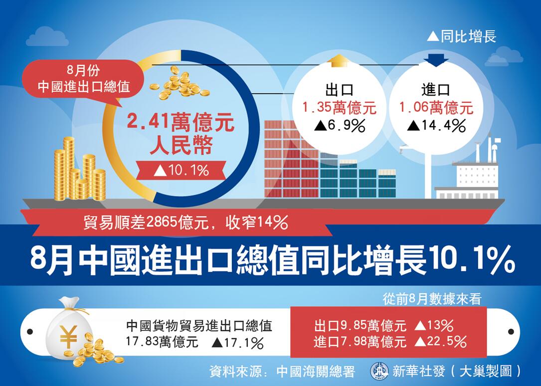 8月中國進出口總值約2.4萬億元人民幣,同比增長10.1%,低於上月增幅2.6個百分點。