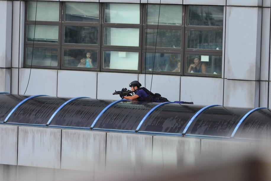机场特警在高处持枪警戒,支援拯救人质的同僚。