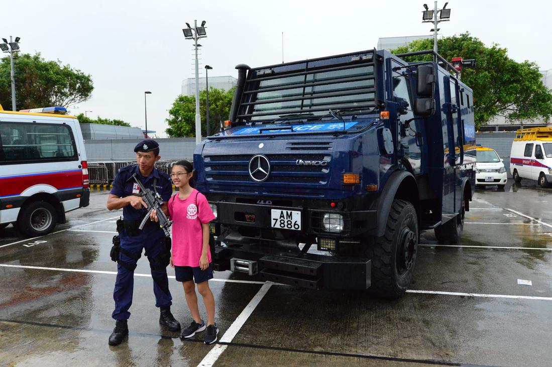 機場警署開放日分上、下午2個時段,縱使小雨不斷,但仍無損市民興致。現場有介紹機場特警由來的歷史館,展出舊式槍械和裝備;另有15個攤位供市民試玩,其中兒童試穿制服區的攤位擠滿人,家長們均紛紛拿出手機拍下子女的英姿;亦有身穿不同年代制服的警員在場內穿梭和市民合照留念,場面熱鬧。