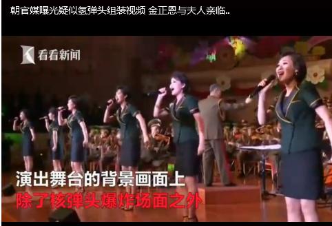 朝鲜中央电视台今天(10日)上午播放了在平壤人民剧场为参与第六次核试验的科技人员庆功而举办的文艺表演现场视频,演出舞台的背景画面上除了核弹头爆炸场面之外,还出现身着防护服的技术人员组装疑似为核弹头的物体。
