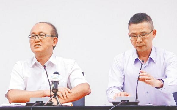 经过9小时讨论,台当局“教育部次长”林腾蛟(左)、“义务教育署署长”邱干国举行记者会,说明最终决议高中语文文言文比例订为45%至55%,维持原案。(图片来源:台湾《中时电子报》)