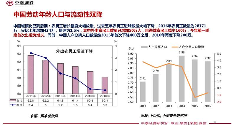 今後五年、十年或者更長期的數據會如何呢?中國經濟高速增長了三十年,2007年走出了第一個頭部,那是最高點;2010年走出了第二個頭部,因為有“兩年4萬億”的公共投資拉動。那麼,為什麼中國經濟增速下行了呢?其中一個較為主要的影響因素是人口:人口老齡化、流動性下降、勞動年齡人口數量減少,這是根本原因。人口變化恰好和我國GDP增速下行時間一致,都發生在2011年。這一年,中國新增外出農民工數量首次出現下降,之後持續下降,至2016年只有50餘萬人。2015年起,中國流動人口數量也開始減少。除了還有一些其他因素之外,我認為用簡單的數學也能做出很好的解釋:即便增量不減少,只要不變或增加的量不夠大,增速必然下降,因為存量越來越大了。