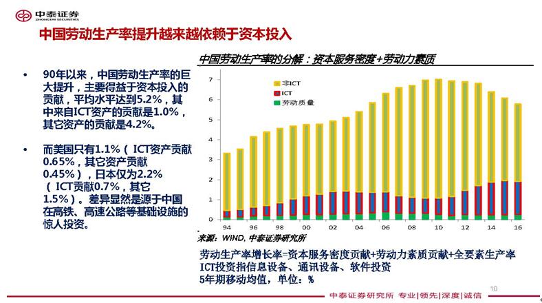 而我們的目標又很高,要實現中華民族的偉大複興,要實現2020年翻番。那麼,如何在上述情況下實現目標呢?在勞動力優勢已不明顯的情況下,只有靠投資來拉動經濟增長。這也就是為什麼我們一直倡導經濟增長模式要從投資拉動轉變為消費拉動的原因,但是,目前仍還是靠投資拉動。投資拉動是比較有效的經濟拉動模式,如果想要通過消費來拉動經濟增長,那麼,服務業的比重就要進一步提高,中國服務業的勞動生產率是低於第二產業的,要中高速增長只有靠資本的投入。