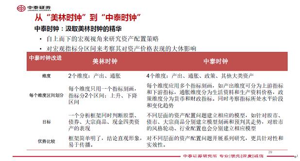 先介紹一下我們做資產配置研究的“中泰時鍾”。大家都知道“美林時鍾”,它是根據經濟周期配置資產,經濟周期的不同階段配置不同的資產。例如,複蘇階段配股票,經濟過熱時配債券,滯脹配大宗商品,衰退配現金。有人戲稱,美林時鍾像電風扇,轉得太快,以至於參照它配置資產時無所適從。