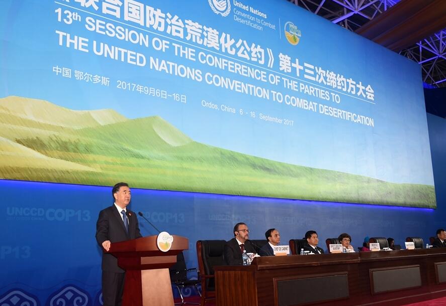 国务院副总理汪洋在开幕式上宣读了习近平的贺信并发表主旨演讲。他强调,中国将认真履行习近平主席在2015年联合国发展峰会上的郑重承诺,以落实2030年可持续发展议程为己任,以新发展理念为引领,把防治荒漠化作为生态文明建设的重要内容,全面加强国际交流合作,努力走出一条中国特色荒漠生态系统治理和民生改善相结合的道路。