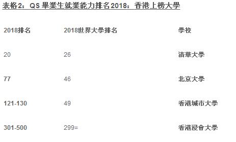 在QS世界大學排名中,香港六所大學都位於世界前100。在今年的QS畢業生就業能力排名中,只有两所大學位列世界前100);