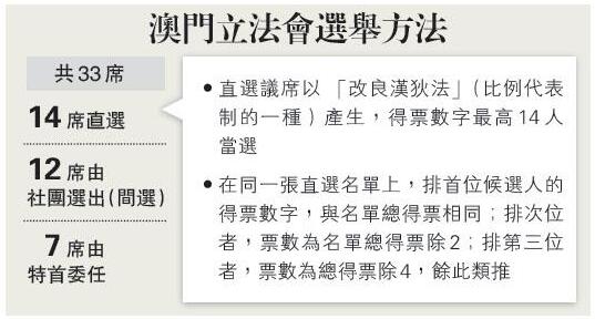 间接选举是澳门特有的选举模式,每个合资格的法人(组织)享有最多22票,目前登记有效的法人(即社团)选民总数为858个。多年以来,间接选举界别有多少议席,社团就事前协商出多少名候选人,令每名候选人均可笃定当选。今年是间接选举界别首次出现差额选举,12个中有3个议席出现竞争。