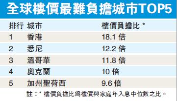年初,美國市場研究公司Demographia發布《2017年國際住房可負擔性調查報告》預言,中國香港將是2017年全球房價最難負擔的城市,市民需努力打工、不吃不喝18年才能買到一層樓截至2016年,香港已經蟬聯7年全球樓價最難負擔城市,澳洲悉尼和加拿大溫哥華緊隨香港之后,分列樓價最難負擔城市第二、第三位。