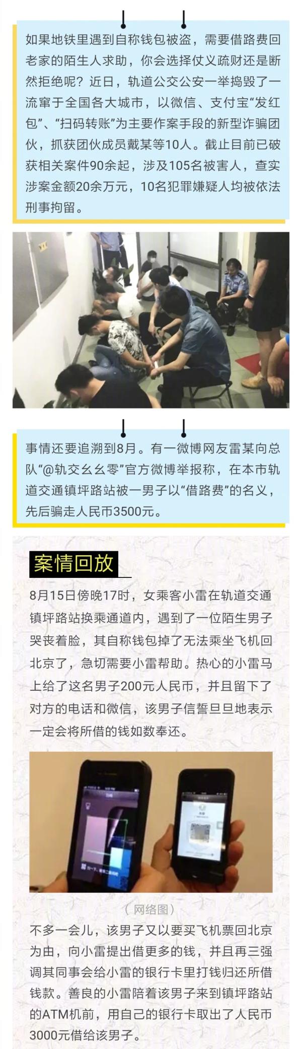 8月15日17时许,一位女性乘客雷晓迪向上海轨交公安官方微博“轨交幺幺零”举报称,当日她在镇坪路换乘站,被一名男子以“借路费”的名义,通过现金、ATM取现、微信转账等方式分3次骗走人民币3500元。