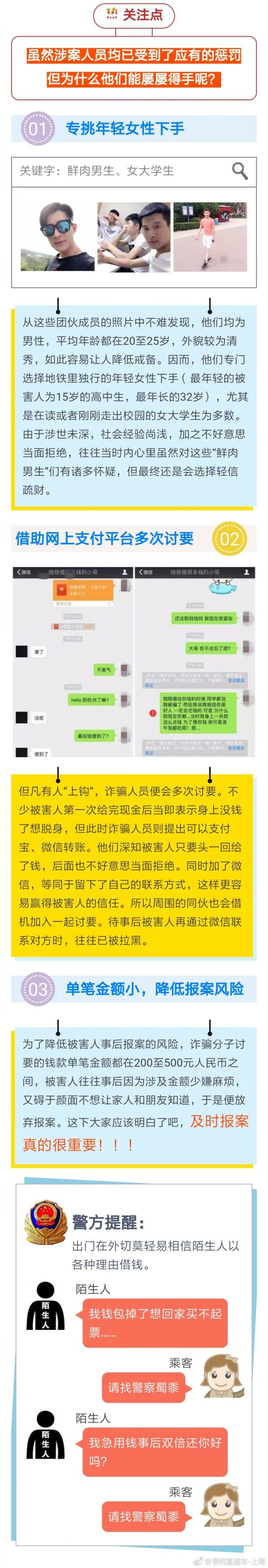 近日,上海警方捣毁一个专门在轨交车站“借路费”的诈骗团伙,成员均为25岁左右青年男子,外貌清秀,专挑20岁左右的年轻女性下手。