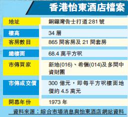 【香港商報網訊】記者鄭珊珊報道:樓市見頂之聲此起彼伏之際,市場再現大手筆交易。市傳文華東方集團旗下的銅鑼灣香港怡東酒店已經完成交易,作價可能問鼎300億元,即每平方尺樓面地價約4.5萬元,看齊美利道50064元的樓面地價紀錄。受消息影響,在新加坡上市的母公司文華東方國際,股價昨日飆升20.75%,收報每股2.56美元。