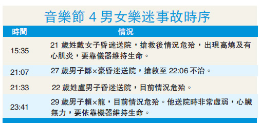 送院證實死亡的男樂迷姓鄒(27歲),據悉任職獵頭公司人力資源顧問,警方稍后將安排剖尸檢驗死因;另外3名情况危殆的男女,包括姓戴(21歲)女子、姓盧(22歲)及賴(29歲)男子,現仍在醫院深切治療部留醫。據悉,部分人的尿液樣本驗出含毒品。