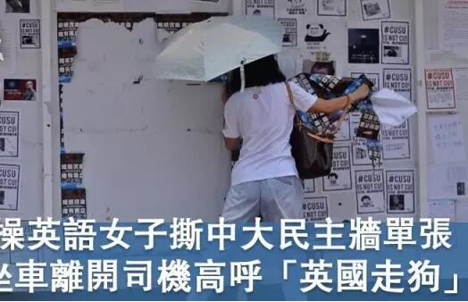 随后一名白衣女子突然大幅度撕走“民主墙”上的标语,正在当值的学生会外务秘书李文耀即上前阻止并询问身份,这名女子未有响应,其后乘坐私人座驾离开。约2分钟后,其座驾驶回现场,司机开窗并大叫“英国走狗”。