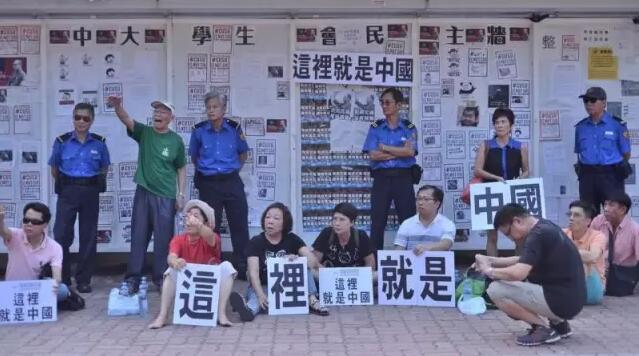 至下午约3时,“爱护香港力量”10多名成员在港中大文化广场高举印有“这里就是中国”等标语,并与学生对峙。10多人坐在港中大“民主墙”前,并将横额贴在“民主墙”上。