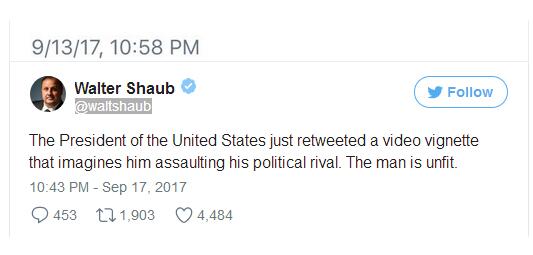 萧波在推特上说,“美国总统刚刚转发了一条想象殴打其政治对手的视频,这人不合适。”萧波最初是以律师的身份进入布什政府的道德操守办公室,之后被任命为奥巴马总统办公室主任。