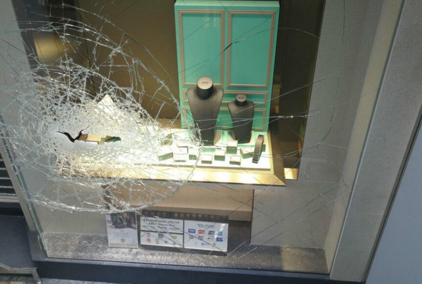 珠宝行橱窗出现裂痕及破口。