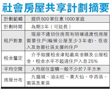 「社會房屋共享計劃」對象是已輪候公屋最少3年、住在不適切住房或低收入人士,為其提供住宿和支援服務,現階段已有26位業主提供332個單位,預計年底可推出至少34個,其餘會在明年上半年陸續推出。有關單位面積介乎200呎到700呎不等。社聯會成立一個社會房屋中介平台,承租及翻新業主提供的閒置單位,再分租給社福機構或社企營運,但不會使用不合法例的住屋,例如違法?房。