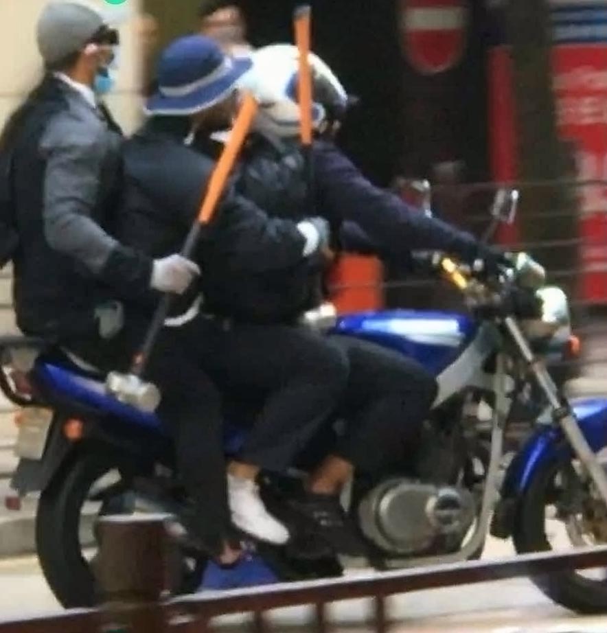 3名劫匪手持大铁锤同乘电单车逃去,过程被途人拍下。