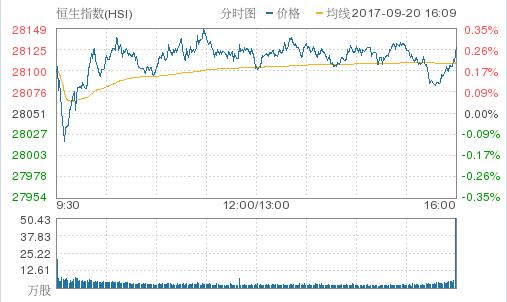 隔晚美股三大指數齊創收市新高,美聯儲局開始一連兩天的議息會議,市場觀望周三聯儲局可能宣布被動式“縮表”方式,讓部分債券到期,不再續買。投資者關注12月份再次加息的線索,由于進口數據表現強勁,市場周二對聯儲局在12月份加息可能性的預期上升到58.3%。恒生指數今早高開0.17%,開盤后曾一度倒跌38點,低見28013點,隨后由跌轉升,最高漲近100點,高見28149點,午后港股繼續上漲。截至收盤,恒生指數漲0.27%,報28127.8點;國企指數漲0.43%,報11173.51點;紅籌指數漲0.5%,報4450.4點。大市成交額970.4億。