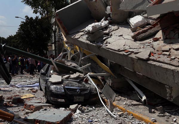 在墨西哥城,房屋和汽車在地震中被損毀。 新華社