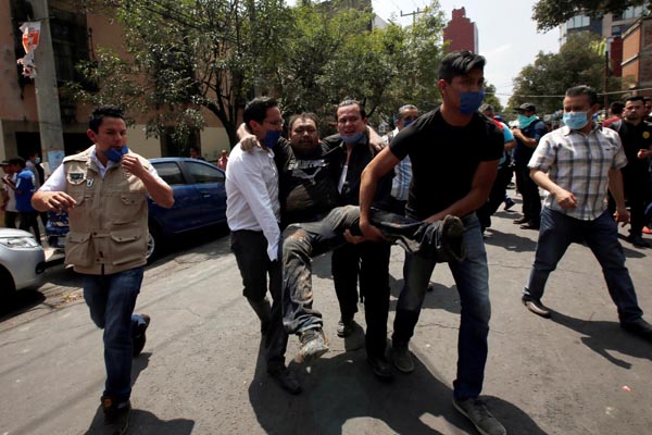 在墨西哥城,有志願者和救援人員在廢墟中尋找幸存者。在救援設備到位前,他們只能徒手刨出瓦礫碎石。在現場,救援人員舉起手,示意大家不要出聲,以便他們能更好地聽到廢墟下幸存者的呼叫。