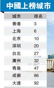除了上海以外,同時入圍的中國內地城市還有北京、深圳、廣州、青島、大連,西部城市成都也首次進入該榜單。在上述城市中,北京上升6位居第10,深圳排在第20位也上升兩位。此外,香港和台北分別排名第3位和第27位。