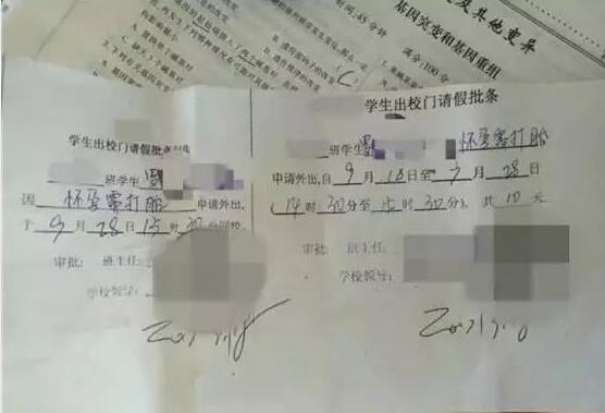 9月18日上午,班主任安排她和另一名同学下午拿班上的扶贫小本出校外去盖章并写了请假条,但没有写上请假事由,就直接给班主任和校领导签字了。