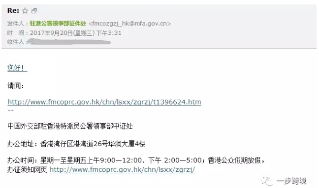 小步激动的说不出话,马上打开了“中华人民共和国外交部驻香港特别行政区特派员公署”(以下简称中国特派员公署)的网站,找到了领事部邮箱,并给他们发了封邮件询问此事。出乎意料的是,很快他们就给了我回复。