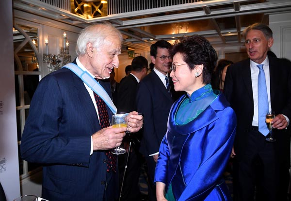 ▲林鄭月娥(前右)在倫敦出席香港貿發局周年晚宴,宴前與前港督衛奕信(前左)交談。