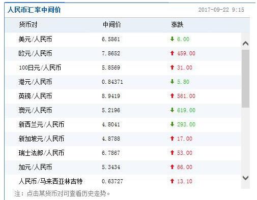 香港万得通讯社报道,9月22日,人民币兑美元中间价调升6个基点,报6.5861,终结三日连贬,前一交易日中间价报6.5867,16:30收盘价报6.5934,23:30夜盘收报6.5922。