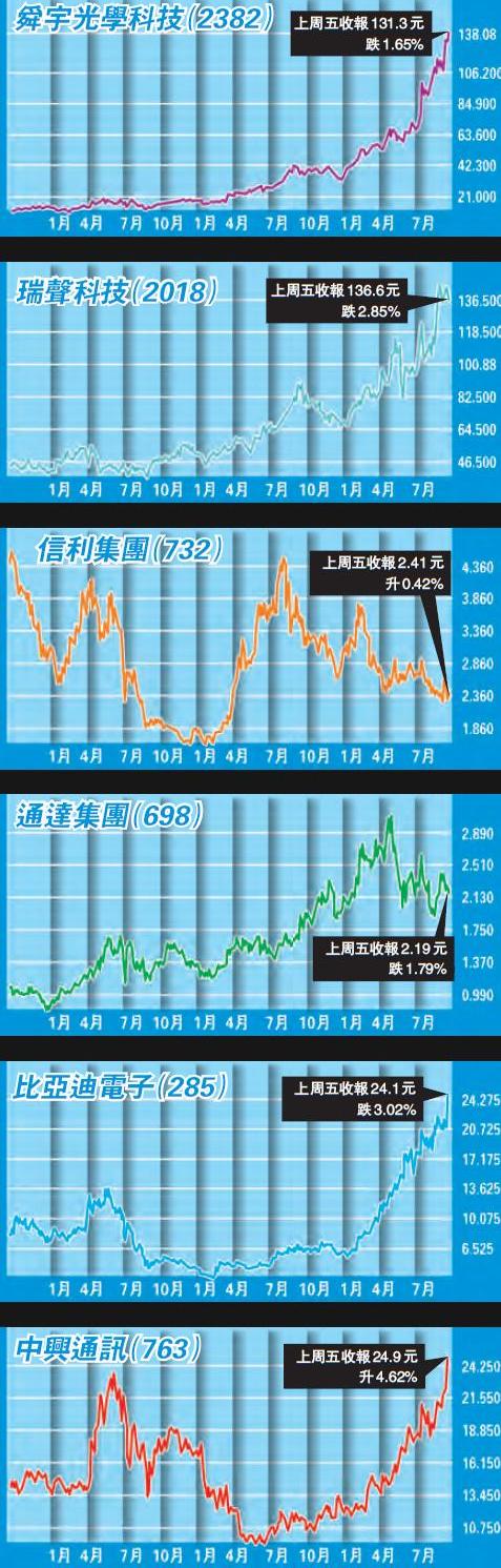 大和指,瑞聲將受惠多個動力,而舜宇光學主要受惠汽車鏡頭及手機鏡頭,不單是蘋果概念股,兩者評級均為買入。蘋果新iPhone手機的規格及配置基本上與預期相同,該行對設備股看法為市場偏樂觀,相關股短期或有回吐,建議趁低收集。