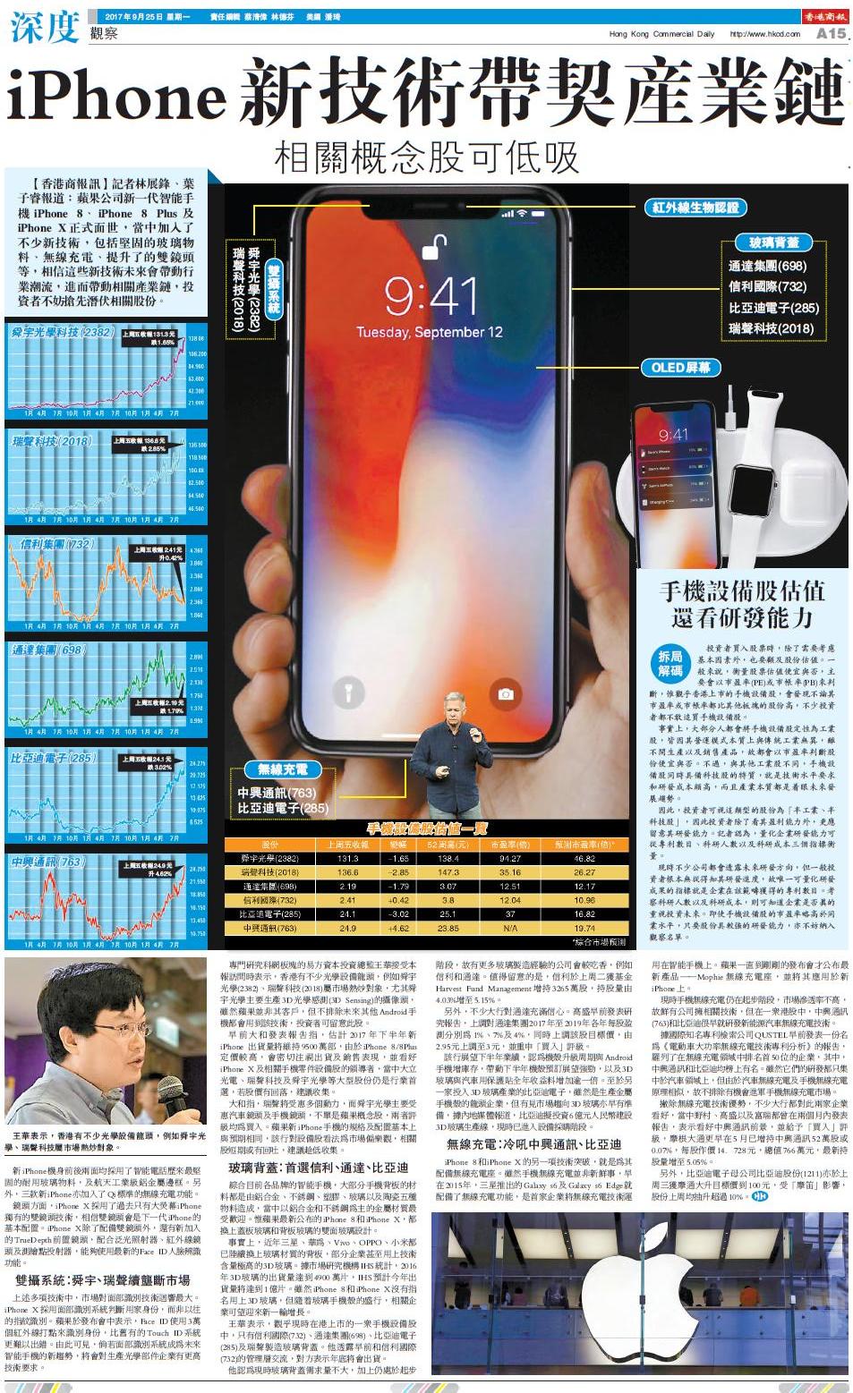 專門研究科網板塊的易方資本投資總監王華接受本報訪問時表示,香港有不少光學設備龍頭,例如舜宇光學(2382)、瑞聲科技(2018)屬市場熱炒對象,尤其舜宇光學主要生產3D光學感測(3DSensing)的攝像頭,雖然蘋果並非其客戶,但不排除未來其他Android手機都會用到該技術,投資者可留意此股。