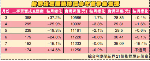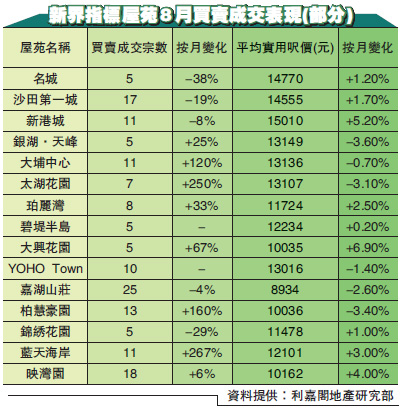至於買賣成交方面,利嘉閣數據顯示,8月新界區主要指標屋苑錄174宗成交,按月急升14.5%,一反早幾月跌勢,平均實用呎價約11256元,按月微升0.2%。 對於整體樓市情況,利嘉閣地產總裁廖偉強表示,由於市場上貨源短缺,業主惜售,加上買家流向一手市場,料二手市場仍將維持「量少價硬」的局面。9月份仍將以一手新盤作主導,預期未來指標屋苑交投量將維持低位徘徊,而樓價則繼續窄幅微升,按月升幅料在0.5%以內。