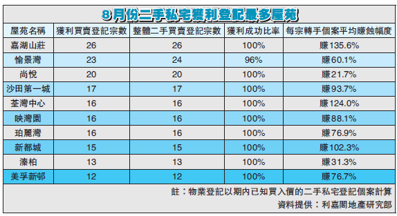 當中10個獲利登記最多的屋苑,其中除美孚新外,9個在新界。有關屋苑平均賺幅介乎21.7%至135.6%不等;期內每宗轉手個案平均賺幅最高者為「嘉湖山莊」,達逾1.3倍;其他賺幅較多的屋苑包括「荃灣中心」及「新都城」,分別達約1.2倍及1倍。