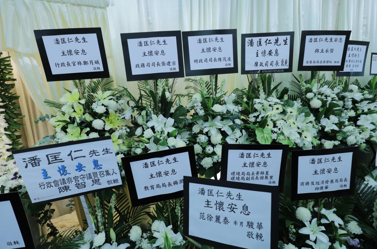 蔡若蓮長子潘匡仁于紅磡世界殯儀館設靈,行政長官林鄭月娥及司局級高官致送花牌。