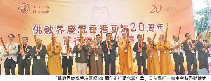 【香港商報网訊】記者霄虹報道:「佛教界慶祝香港回歸20周年正行覺念嘉年華」日前假九龍旺角花墟公園隆重舉行。民政事務局署理局長陳積志、中聯辦協調部副部長張強、香港佛教聯合會會長智慧長老等出席主禮,香港觀宗寺方丈,香海正覺蓮社社長宏明大和尚擔任大會主席。數千市民參與是次嘉年華,場面宏大,氣氛祥和。