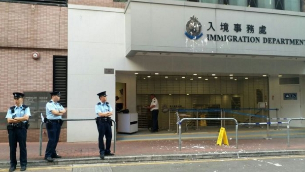 入境事務處西九龍辦事處遭人潑白油。警方正展開調查,暫時未有人被捕,將案件列作刑事毀壞。