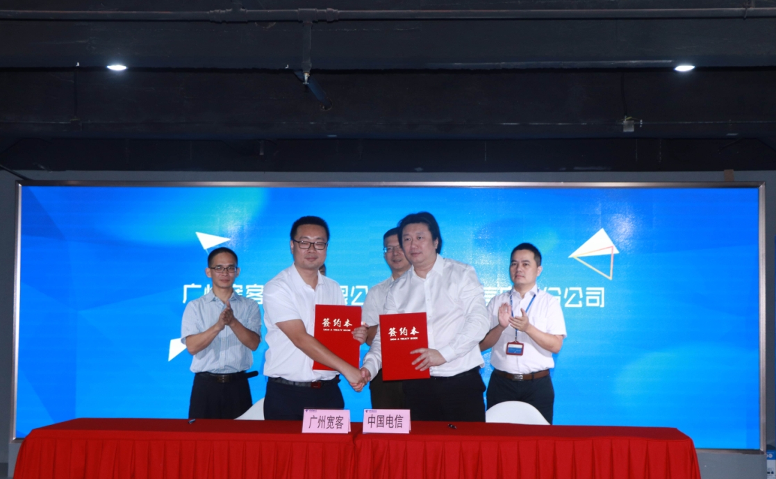广州宽客科技有限公司总经理张惠平与中国电信广州分公司副总经理张晖互换合作协议,标志着双方合作进入新的起点。