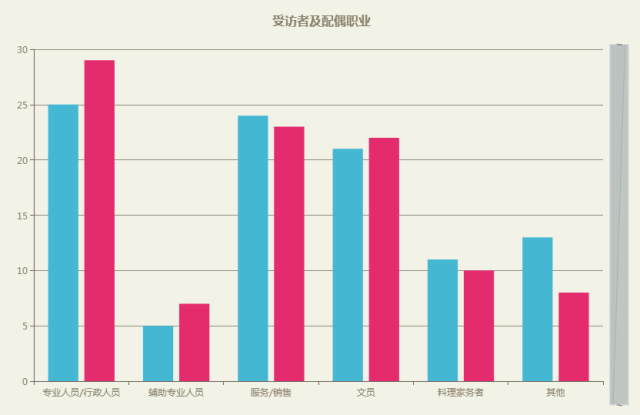 跨境婚姻中两方职业为行政/专业人员所占的百分比最多(红色为受访者、蓝色为受访者配偶)