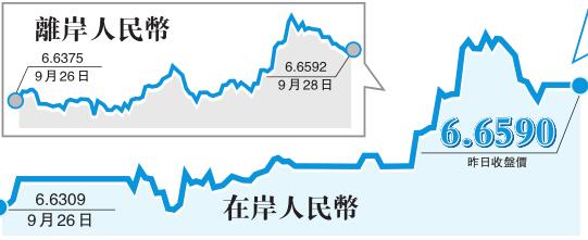 離岸人民幣兌美元昨日最低報6.6727元,日內一度跌超300點。在岸人民幣同樣表現疲軟,也曾一度跌破6.67關口,創逾一個月新低。人民幣中間價則是連續第四日下調。