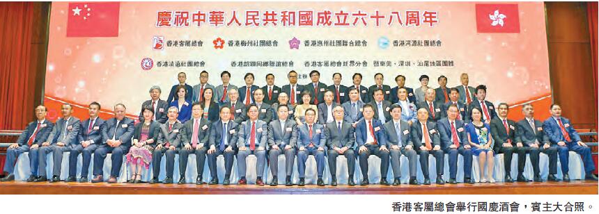 【香港商報网訊】記者李嘉倩報道:香港客屬總會慶祝中華人民共和國成立68周年酒會,昨日假香港龍堡國際賓館隆重舉行,中聯辦副主任何靖、外交部駐港副特派員胡建中、民政事務局局長劉江華、保安局局長李家超等蒞臨主禮,與該會主席吳惠權、執行主席曾智明及在場逾千名鄉親友好、政商翹楚歡聚一堂,同申慶賀,場面熱鬧。