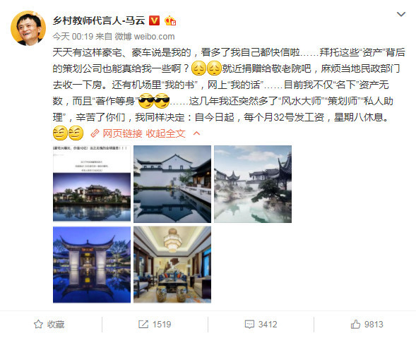 天天有這樣豪宅、豪車說是我的,看多了我自己都快信啦……拜托這些“資產”背後的策劃公司也能真給我一些啊?[失望][失望]就近捐贈給敬老院吧,麻煩當地民政部門去收一下房。還有機場裏“我的書”,網上“我的話”……目前我不僅“名下”資產無數,而且“著作等身”……這幾年我還突然多了“風水大師”“策劃師”“私人助理”,辛苦了你們,我同樣決定:自今日起,每個月32號發工資,星期八休息。
