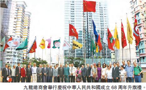 【香港商報网訊】記者李嘉倩報道:九龍總商會昨日在該會會所平臺舉行慶祝中華人民共和國成立68周年升旗禮,中聯辦九龍工作部處長沈燕雄應邀擔任主禮嘉賓,與該會監事長黃熾雄、副理事長袁家樂等首長共同主持升旗儀式。