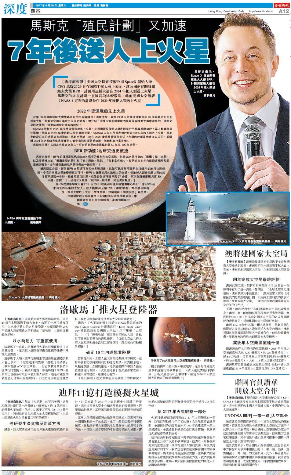 【香港商報网訊】美國太空探索技術公司SpaceX創始人兼CEO馬斯克29日在國際宇航大會上表示,該公司正在開發超級大火箭BFR,計劃用這種火箭在2024年把人類送上火星。馬斯克的火星計劃一直被認為比較激進,此前美國太空總署(NASA)宣布的計劃是在2030年后把人類送上火星。