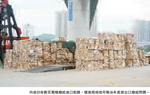國家環保部表示,2017年底前,尚有數百萬公噸的進口許可證配額可吸納境外廢紙,但當中可吸納多少香港進口的廢紙,將視乎個別企業的商業考慮。