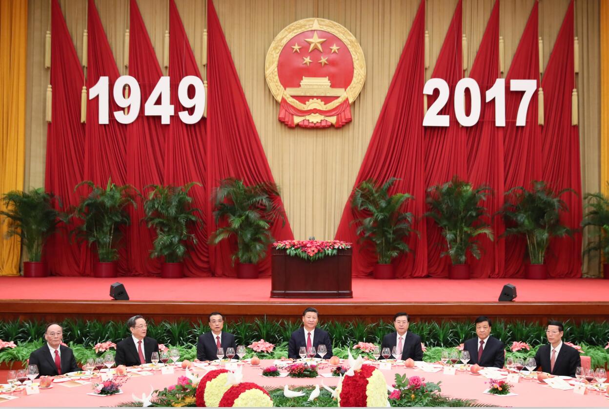 人民大會堂宴會廳華燈璀璨,賓朋濟濟一堂,氣氛喜慶熱烈。17時30分許,伴隨歡快的《迎賓曲》,習近平等黨和國家領導人步入宴會廳,全場響起熱烈掌聲。