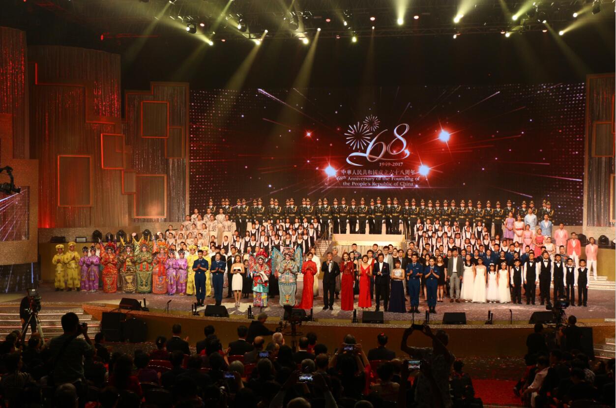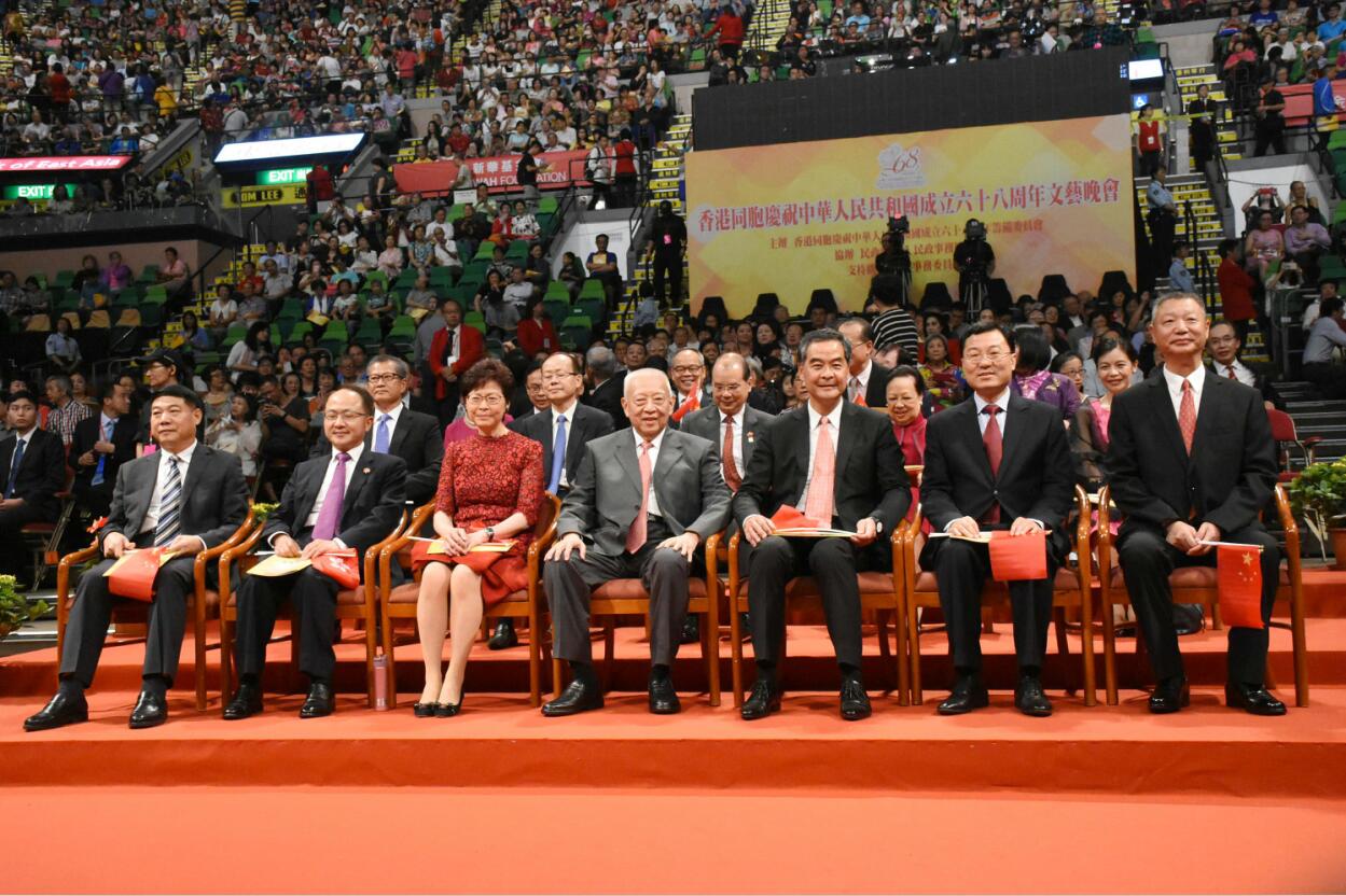 【香港商報网訊】記者李嘉倩報道:香港同胞慶祝中華人民共和國成立68周年文藝晚會昨晚假紅磡香港體育館舉行,全國政協副主席董建華伉儷、全國政協副主席梁振英、行政長官林鄭月娥、中聯辦主任王志民、外交部駐港特派員謝鋒伉儷、解放軍駐港部隊司令員譚本宏、解放軍駐港部隊政委岳世鑫等重量級嘉賓出席晚會,與6000名市民齊賞精彩演出,共慶祖國華誕。
