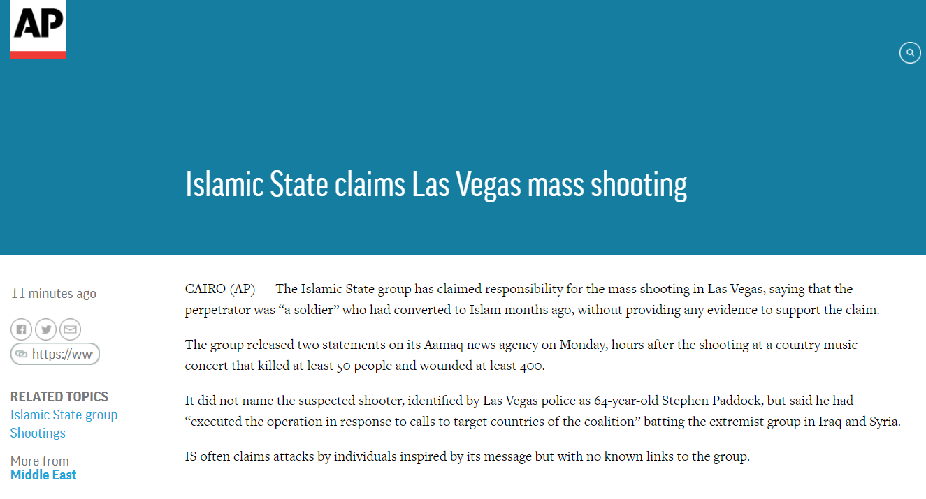 據美聯社消息,極端組織‘伊斯蘭國’(IS)宣稱對美國拉斯維加斯槍擊事件負責,該組織表示該名槍手在數月前加入伊斯蘭教。但該組織並未提供相應證據。